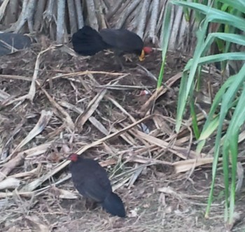 Australian brush turkeys, also called scrub or bush turkeys. The male is building the hollowed mound nest from leaves, other combustible material and earth. Typically more than one female will lay eggs there and the male then tends the nest for the next seven weeks till hatching. He checks the temperature regularly with his bill, then taking bits out or adding, to manage the temperature in a range of 33-38 degrees C (91-100 F). They look cute enough, but create a lot of mess along the beach walkways and if they nest near backyard gardens are known to acquire the gardeners’ mulch for their nests. Which may help to explain why they are listed on one site as one of a group of Australian âbirds behaving badly.”