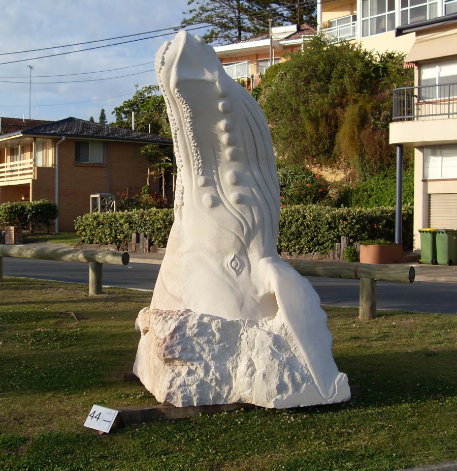 At this time of the year it’s a common occurrence for us to see one or more whales just offshore from our local beaches, on their annual migration north. Occasionally we are lucky enough to see one breaching. The picture is of one of the sculptures in the 2008 Swell sculpture festival â an annual event – at Currumbin Beach, about 15 minutes from where we live. âHelidon Breachâ, the title of the work by Matthew Bath, references both the magnificent sight of a whale breaching and the source of the beautiful white Australian sandstone from Helidon, Queensland.