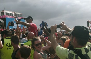 Kelly Slater, ASP 10X World Champion surfer is being chaired up the beach at Snapper Rocks, Queensland, Australia, just after winning Quiksilver Pro, March 2011.